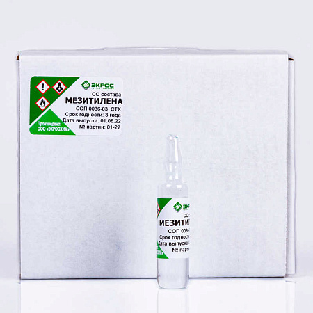 Стандартный образец состава мезитилена (1,3,5-триметилбензола) (СОП 0036-03 СТХ) предназначен для градуировки хроматографов, а также метрологической аттестации и контроля погрешности методик выполнения измерений содержания мезитилена в объектах окружающей среды, биологических материалах, технических продуктах.