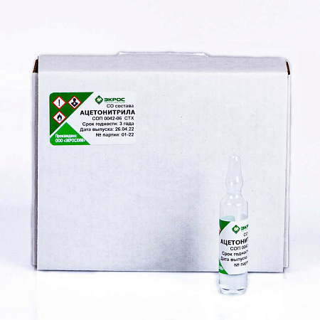 Стандартный образец состава ацетонитрила (СОП 0042-06  СТХ) предназначен для градуировки хроматографов, для аттестации методик измерений и контроля точности результатов измерений содержания ацетонитрила в объектах окружающей среды, пищевых и технических продуктах, биопробах и других веществах и материалах.