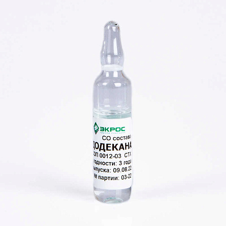 Стандартный образец состава додекана (СОП 0012-03 СТХ) предназначен для градуировки хроматографов, для аттестации методик измерений и контроля точности результатов измерений содержания додекана в объектах окружающей среды, биологических материалах, технических продуктах.