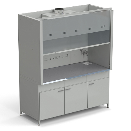 - В шкафу установлена сливная раковина из полипропилена, а на задней стенке установлен один химстойкий лабораторный кран для подвода воды;