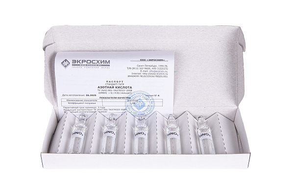 10 glass ampoules with nitric acid solution, packed in a cardboard box.