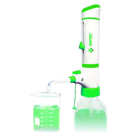 Designed for precise dosing of liquids in the range from 0.25 to 100 ml from containers with different neck diameters.