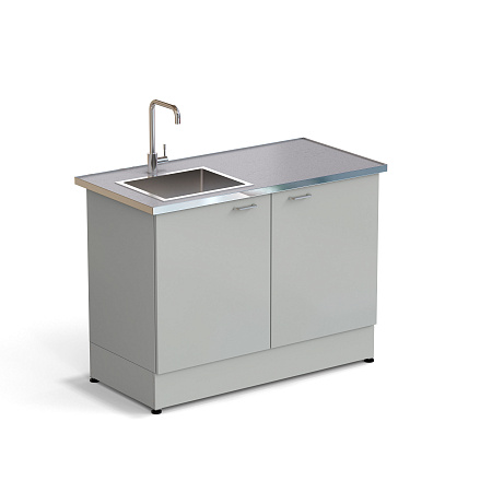 The sink table consists of a metal frame with installed doors and a set of plumbing accessories.