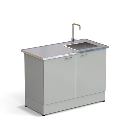 The sink table consists of a metal frame with installed doors and a set of plumbing accessories.
