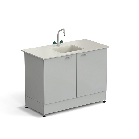 The sink table consists of a metal frame with installed doors and a set of plumbing accessories.