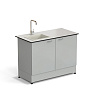 The sink table consists of a metal frame with installed doors and a set of plumbing accessories.