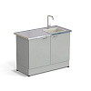 The sink table consists of a metal frame with installed doors and a set of plumbing accessories.