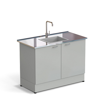 The sink table consists of a metal frame with installed doors and a set of plumbing accessories.