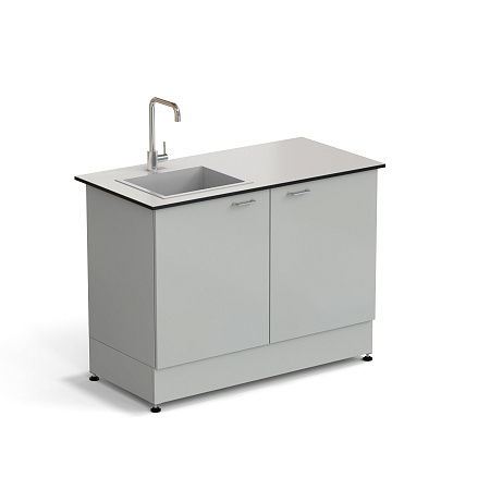 The sink table consists of a metal frame with installed doors and a set of plumbing accessories.