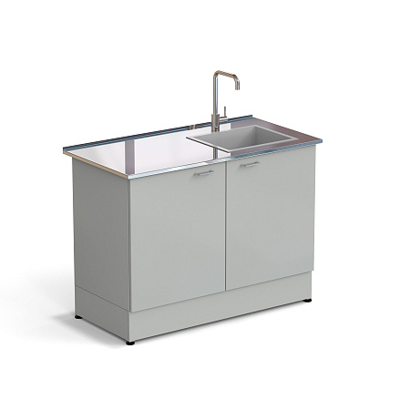 The sink table consists of a metal frame with installed doors and a set of plumbing accessories.