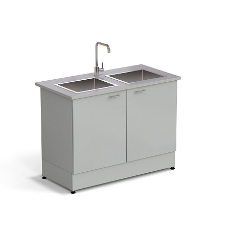 The sink table consists of a metal frame with installed doors and a set of plumbing accessories.