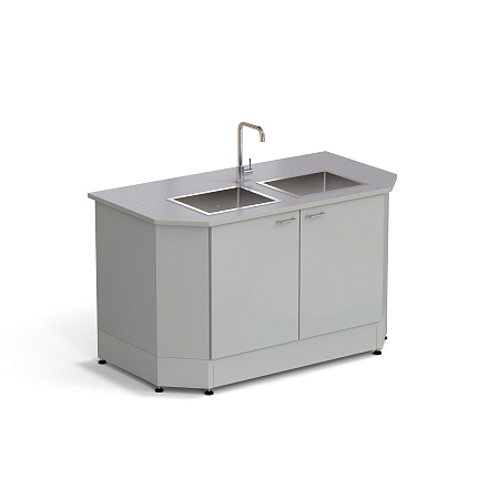 Additionally, it can be equipped with a wall dryer for dishes, a chemically resistant faucet, a splash shield, a back closure, and a distiller attachment.