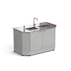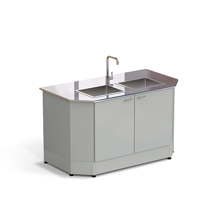 Additionally, it can be equipped with a wall dryer for dishes, a chemically resistant faucet, a splash shield, a back closure, and a distiller attachment.