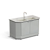 Additionally, it can be equipped with a wall dryer for dishes, a chemically resistant faucet, a splash shield, a back closure, and a distiller attachment.