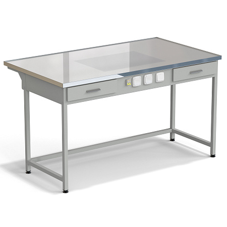 Laboratory bench with illumination of working area 1515x850x850 mm, worktop material - melamine LABGRADE-light, grey metal