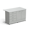- Стол-тумба имеет две металлические дверцы и четыре выдвижных ящика, полку, устанавливается на регулируемые опоры для компенсации неровностей пола;