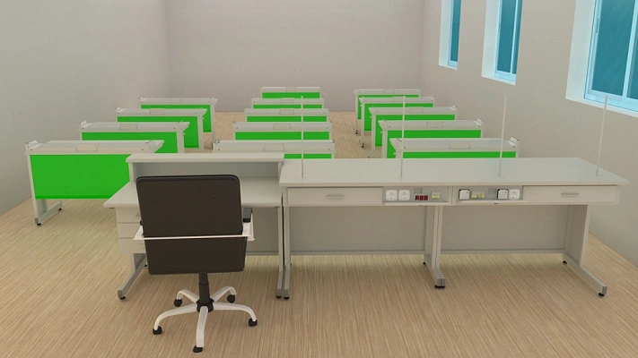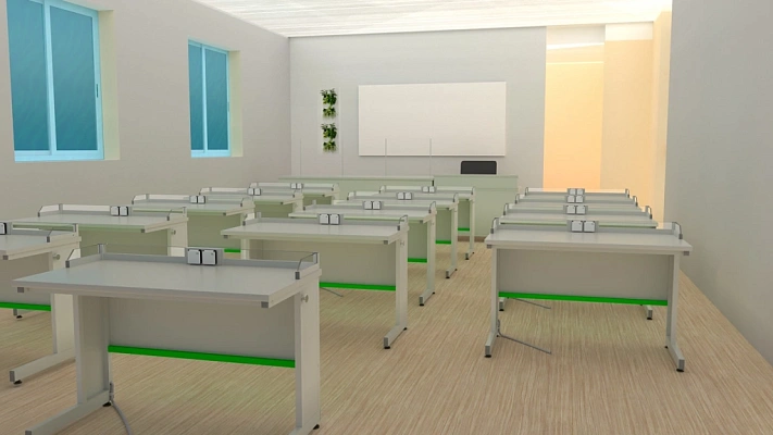 Специалисты компании подобрали наиболее подходящее цветовое решение мебели, а так же разработали 3D визуализацию проекта по требованиям заказчика. Ученические столы исполнены в ярком зеленом цвете.