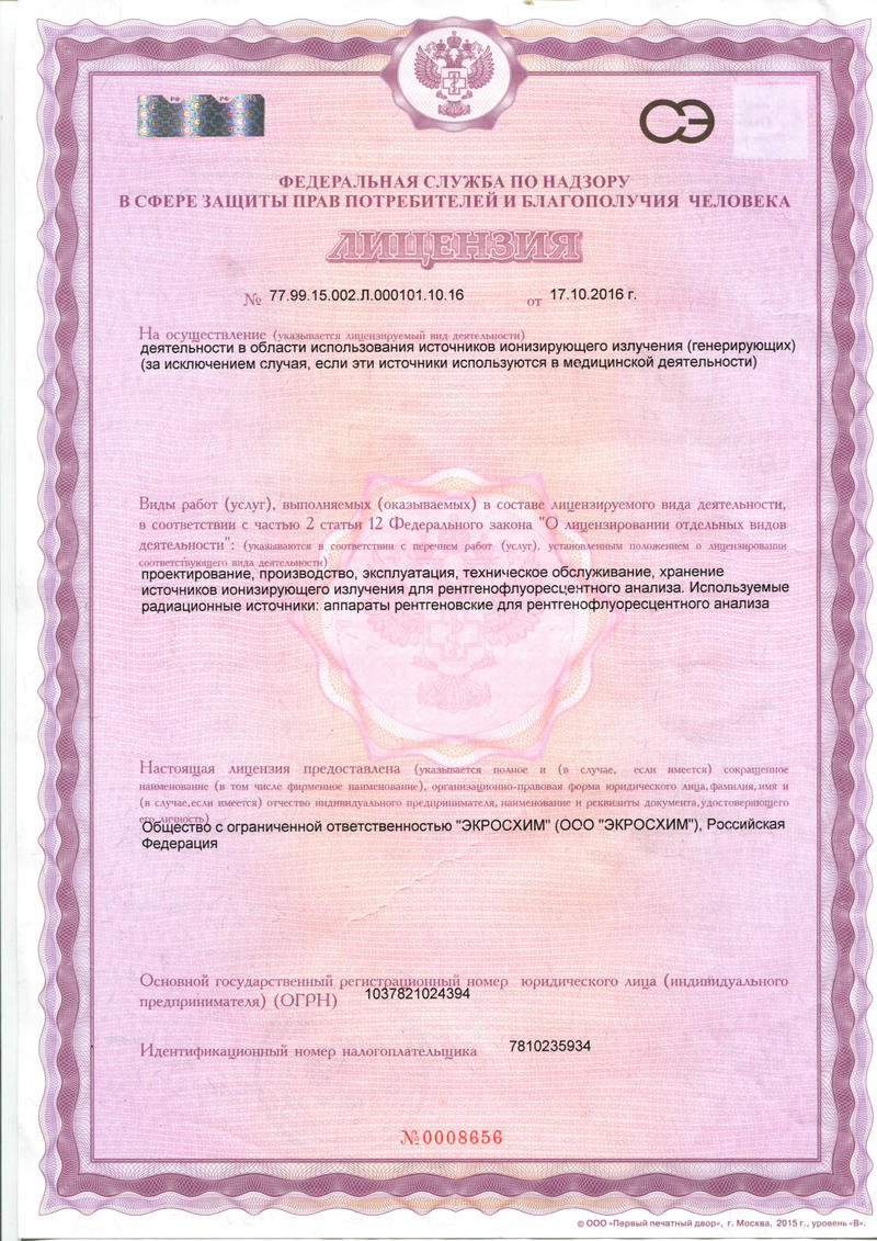Лицензия на разработку, производство и техническое обслуживание рентгенофлуоресцентных анализаторов