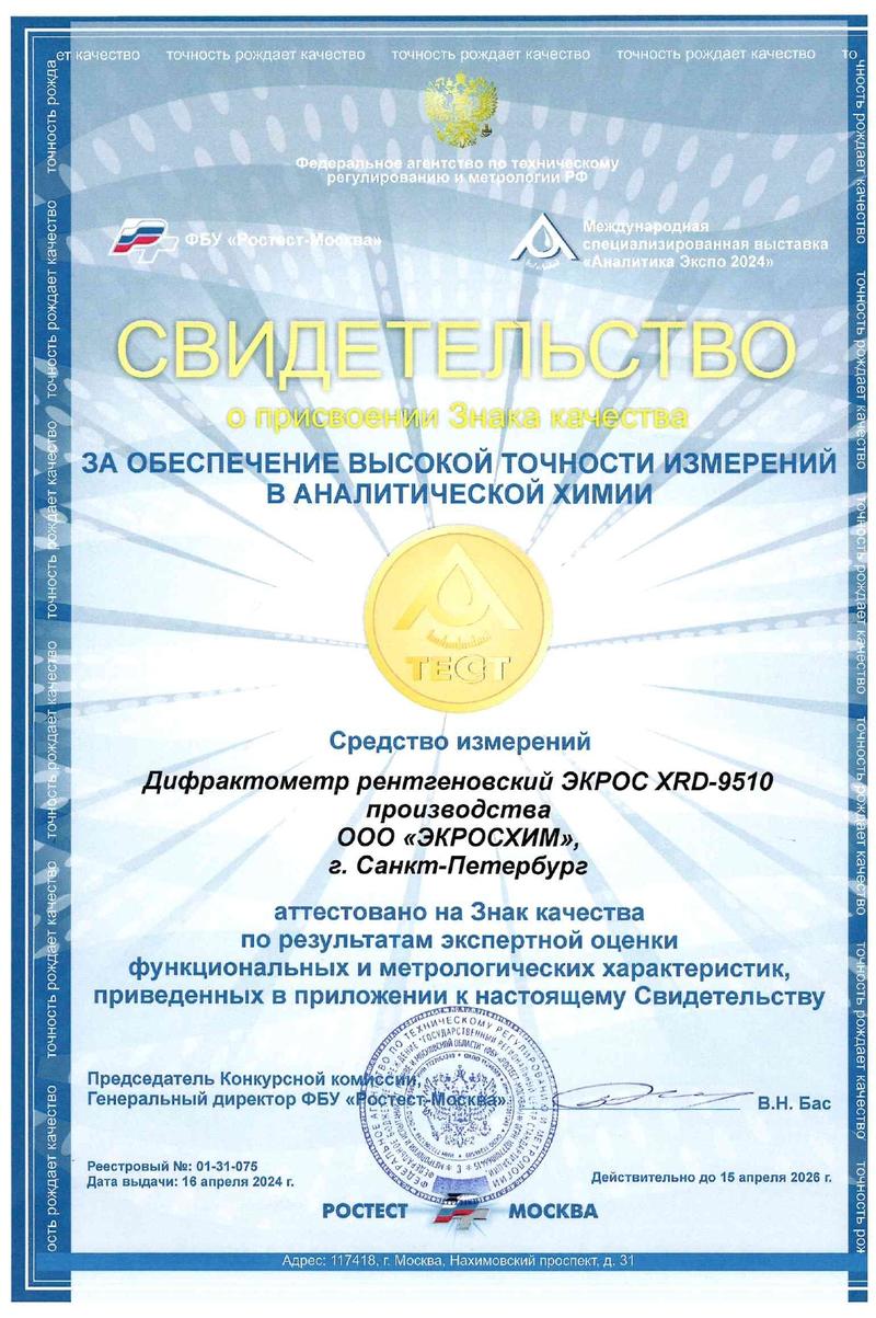 Свидетельство о присвоении Знака качества на дифрактометр рентгеновский ЭКРОС XRD-9510